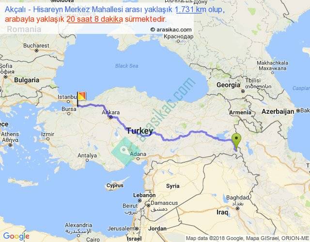 Akçalı - Hisareyn Merkez Mahallesi arası yaklaşık olarak 90 km/h ile yukarıda belirtilen sürede olup, iki yerin kuş uçuşu uzaklığı (mesafesi) 1279'dir. Eğer belirtilen yerler arasında uçak seferi var ise bu süre uçakla 1 saat 58 dakika'ya kadar düşebilir. Yolculuk otobüsle 1 gün 2 saat sürmektedir.