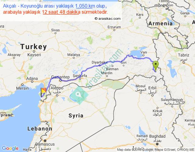 Akçalı - Koyunoğlu arası yaklaşık olarak 90 km/h ile yukarıda belirtilen sürede olup, iki yerin kuş uçuşu uzaklığı (mesafesi) 745'dir. Eğer belirtilen yerler arasında uçak seferi var ise bu süre uçakla 1 saat 08 dakika'ya kadar düşebilir. Yolculuk otobüsle 16 saat 38 dakika sürmektedir.