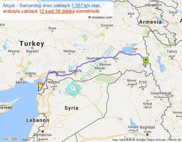 Akçalı - Samandağ arası yaklaşık olarak 90 km/h ile yukarıda belirtilen sürede olup, iki yerin kuş uçuşu uzaklığı (mesafesi) 750'dir. Eğer belirtilen yerler arasında uçak seferi var ise bu süre uçakla 1 saat 09 dakika'ya kadar düşebilir. Yolculuk otobüsle 16 saat 51 dakika sürmektedir.