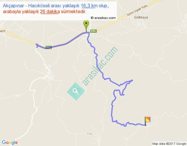 Akçapınar - Hacıköseli arası yaklaşık olarak 90 km/h ile yukarıda belirtilen sürede olup, iki yerin kuş uçuşu uzaklığı (mesafesi) 6'dir. Yolculuk otobüsle 33 dakika sürmektedir.