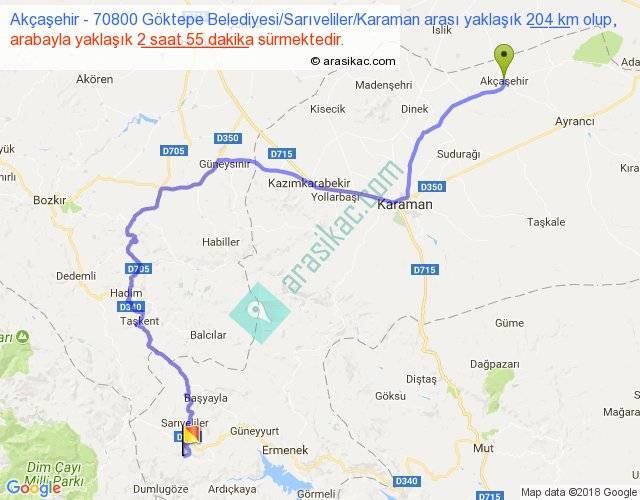 Akçaşehir - 70800 Göktepe Belediyesi Sarıveliler Karaman arası yaklaşık olarak 90 km/h ile yukarıda belirtilen sürede olup, iki yerin kuş uçuşu uzaklığı (mesafesi) 119'dir. Yolculuk otobüsle 3 saat 47 dakika sürmektedir.