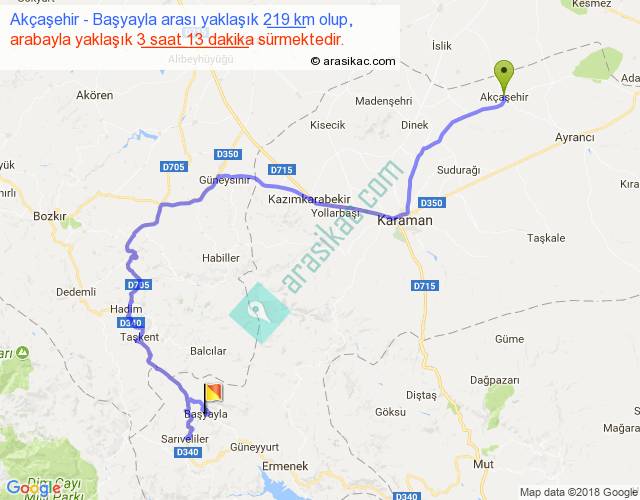 Akçaşehir - Başyayla arası yaklaşık olarak 90 km/h ile yukarıda belirtilen sürede olup, iki yerin kuş uçuşu uzaklığı (mesafesi) 105'dir. Yolculuk otobüsle 4 saat 10 dakika sürmektedir.