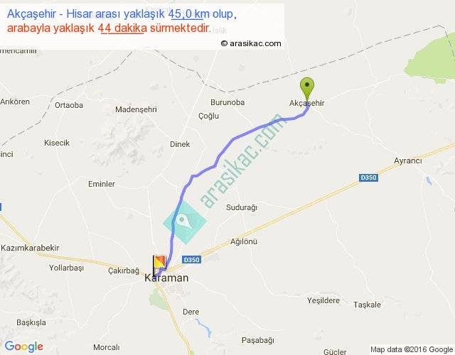 Akçaşehir - Hisar arası yaklaşık olarak 90 km/h ile yukarıda belirtilen sürede olup, iki yerin kuş uçuşu uzaklığı (mesafesi) 39'dir. Yolculuk otobüsle 57 dakika sürmektedir.