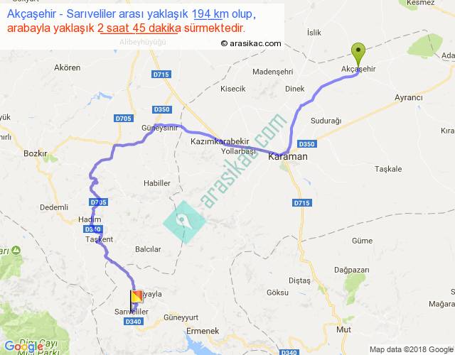 Akçaşehir - Sarıveliler arası yaklaşık olarak 90 km/h ile yukarıda belirtilen sürede olup, iki yerin kuş uçuşu uzaklığı (mesafesi) 113'dir. Yolculuk otobüsle 3 saat 34 dakika sürmektedir.
