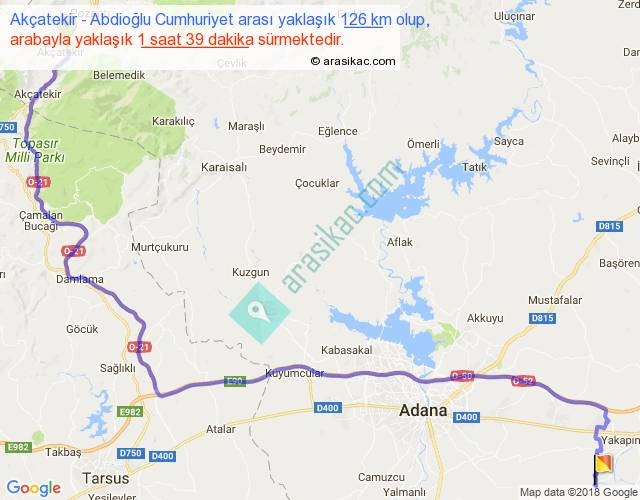 Akçatekir - Abdioğlu Cumhuriyet arası yaklaşık olarak 90 km/h ile yukarıda belirtilen sürede olup, iki yerin kuş uçuşu uzaklığı (mesafesi) 83'dir. Yolculuk otobüsle 2 saat 8 dakika sürmektedir.