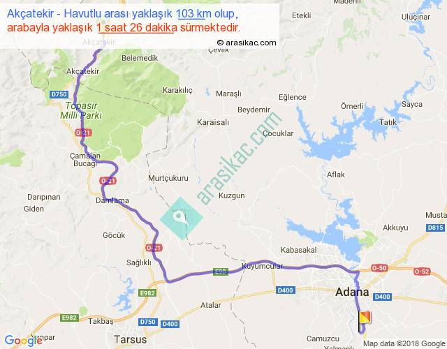 Akçatekir - Havutlu arası yaklaşık olarak 90 km/h ile yukarıda belirtilen sürede olup, iki yerin kuş uçuşu uzaklığı (mesafesi) 67'dir. Yolculuk otobüsle 1 saat 51 dakika sürmektedir.