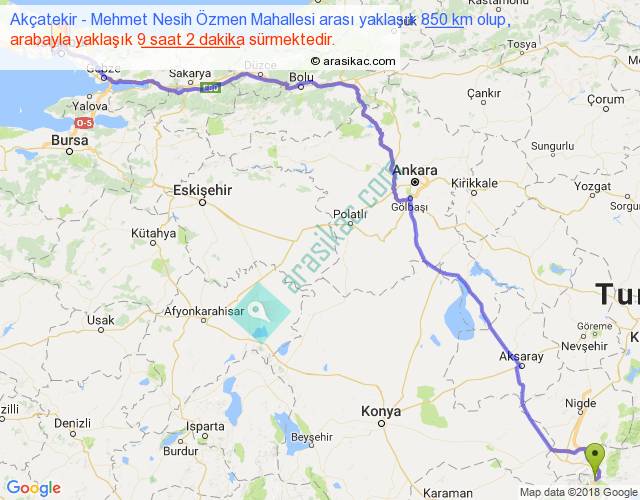Akçatekir - Mehmet Nesih Özmen Mahallesi arası yaklaşık olarak 90 km/h ile yukarıda belirtilen sürede olup, iki yerin kuş uçuşu uzaklığı (mesafesi) 649'dir. Eğer belirtilen yerler arasında uçak seferi var ise bu süre uçakla 59 dakika'ya kadar düşebilir. Yolculuk otobüsle 11 saat 44 dakika sürmektedir.