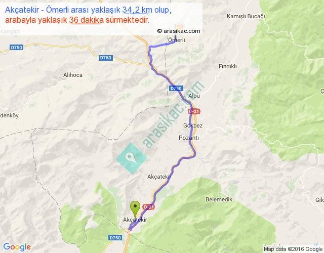 Akçatekir - Ömerli arası yaklaşık olarak 90 km/h ile yukarıda belirtilen sürede olup, iki yerin kuş uçuşu uzaklığı (mesafesi) 22'dir. Yolculuk otobüsle 46 dakika sürmektedir.