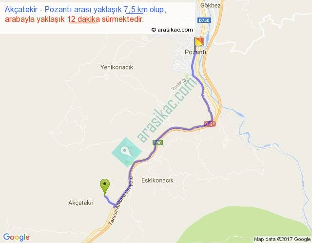 Akçatekir - Pozantı arası yaklaşık olarak 90 km/h ile yukarıda belirtilen sürede olup, iki yerin kuş uçuşu uzaklığı (mesafesi) 5'dir. Yolculuk otobüsle 15 dakika sürmektedir.