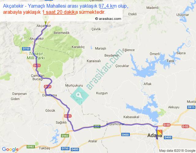 Akçatekir - Yamaçlı Mahallesi arası yaklaşık olarak 90 km/h ile yukarıda belirtilen sürede olup, iki yerin kuş uçuşu uzaklığı (mesafesi) 63'dir. Yolculuk otobüsle 1 saat 44 dakika sürmektedir.