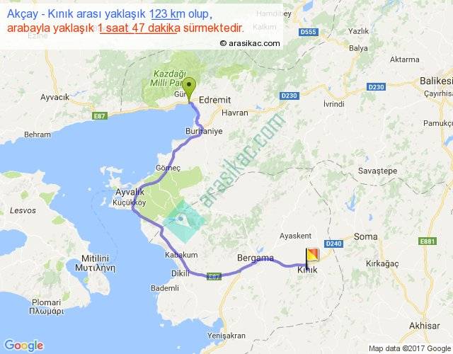 Akçay - Kınık arası yaklaşık olarak 90 km/h ile yukarıda belirtilen sürede olup, iki yerin kuş uçuşu uzaklığı (mesafesi) 68'dir. Yolculuk otobüsle 2 saat 19 dakika sürmektedir.