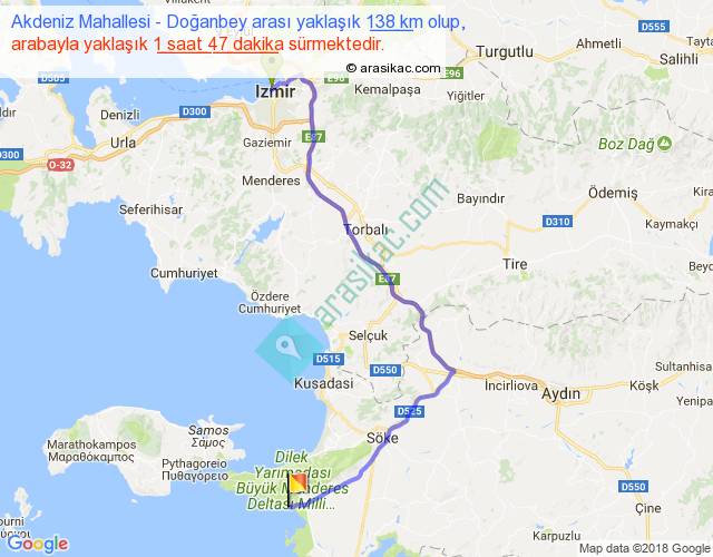 Akdeniz Mahallesi - Doğanbey arası yaklaşık olarak 90 km/h ile yukarıda belirtilen sürede olup, iki yerin kuş uçuşu uzaklığı (mesafesi) 90'dir. Yolculuk otobüsle 2 saat 19 dakika sürmektedir.