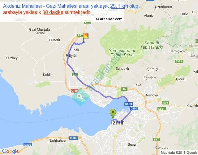 Akdeniz Mahallesi - Gazi Mahallesi arası yaklaşık olarak 90 km/h ile yukarıda belirtilen sürede olup, iki yerin kuş uçuşu uzaklığı (mesafesi) 16'dir. Yolculuk otobüsle 49 dakika sürmektedir.