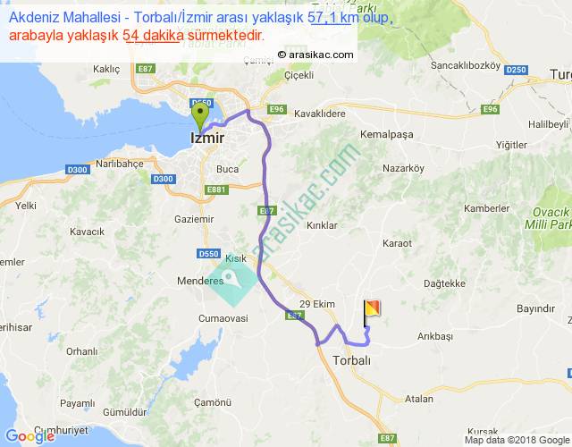 Akdeniz Mahallesi - Torbalı İzmir arası yaklaşık olarak 90 km/h ile yukarıda belirtilen sürede olup, iki yerin kuş uçuşu uzaklığı (mesafesi) 34'dir. Yolculuk otobüsle 1 saat 10 dakika sürmektedir.