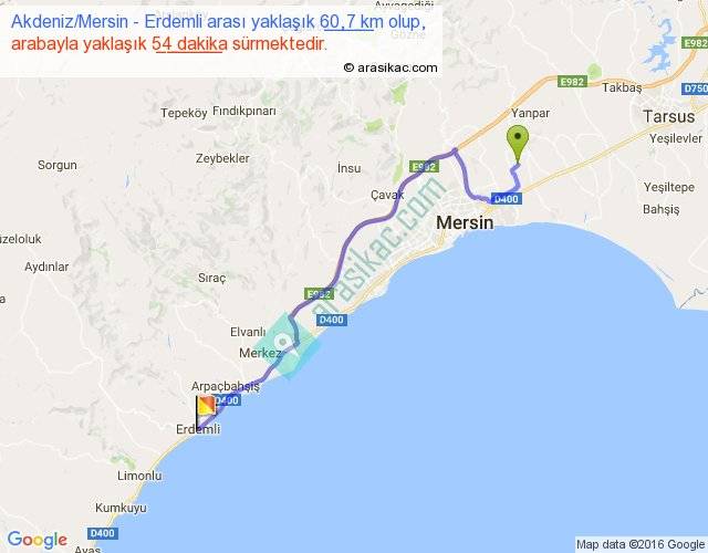 Akdeniz Mersin - Erdemli arası yaklaşık olarak 90 km/h ile yukarıda belirtilen sürede olup, iki yerin kuş uçuşu uzaklığı (mesafesi) 46'dir. Yolculuk otobüsle 1 saat 10 dakika sürmektedir.