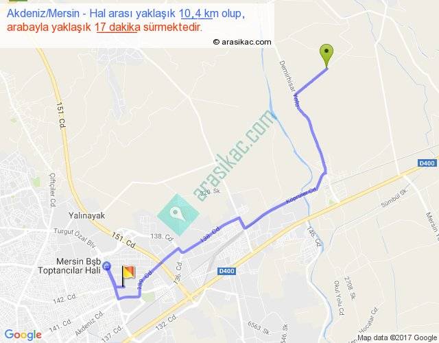 Akdeniz Mersin - Hal arası yaklaşık olarak 90 km/h ile yukarıda belirtilen sürede olup, iki yerin kuş uçuşu uzaklığı (mesafesi) 7'dir. Yolculuk otobüsle 22 dakika sürmektedir.