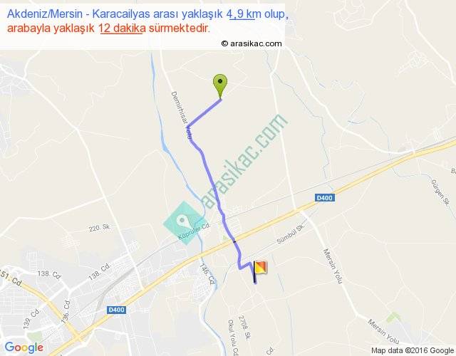 Akdeniz Mersin - Karacailyas arası yaklaşık olarak 90 km/h ile yukarıda belirtilen sürede olup, iki yerin kuş uçuşu uzaklığı (mesafesi) 4'dir. Yolculuk otobüsle 15 dakika sürmektedir.