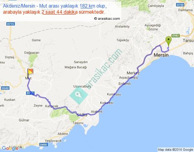 Akdeniz Mersin - Mut arası yaklaşık olarak 90 km/h ile yukarıda belirtilen sürede olup, iki yerin kuş uçuşu uzaklığı (mesafesi) 115'dir. Yolculuk otobüsle 3 saat 33 dakika sürmektedir.