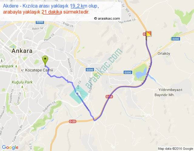 Akdere - Kızılca arası yaklaşık olarak 90 km/h ile yukarıda belirtilen sürede olup, iki yerin kuş uçuşu uzaklığı (mesafesi) 10'dir. Yolculuk otobüsle 27 dakika sürmektedir.