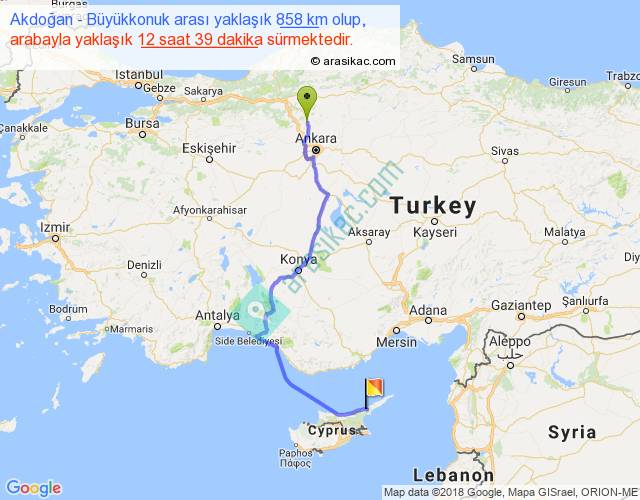 Akdoğan - Büyükkonuk arası yaklaşık olarak 90 km/h ile yukarıda belirtilen sürede olup, iki yerin kuş uçuşu uzaklığı (mesafesi) 561'dir. Eğer belirtilen yerler arasında uçak seferi var ise bu süre uçakla 51 dakika'ya kadar düşebilir. Yolculuk otobüsle 16 saat 26 dakika sürmektedir.