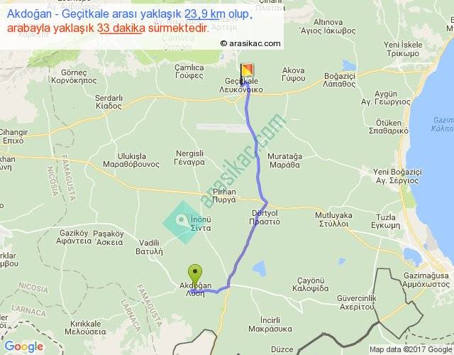 Akdoğan - Geçitkale arası yaklaşık olarak 90 km/h ile yukarıda belirtilen sürede olup, iki yerin kuş uçuşu uzaklığı (mesafesi) 18'dir. Yolculuk otobüsle 42 dakika sürmektedir.
