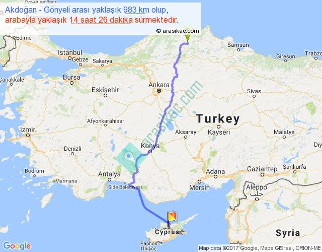 Akdoğan - Gönyeli arası yaklaşık olarak 90 km/h ile yukarıda belirtilen sürede olup, iki yerin kuş uçuşu uzaklığı (mesafesi) 699'dir. Eğer belirtilen yerler arasında uçak seferi var ise bu süre uçakla 1 saat 04 dakika'ya kadar düşebilir. Yolculuk otobüsle 18 saat 45 dakika sürmektedir.