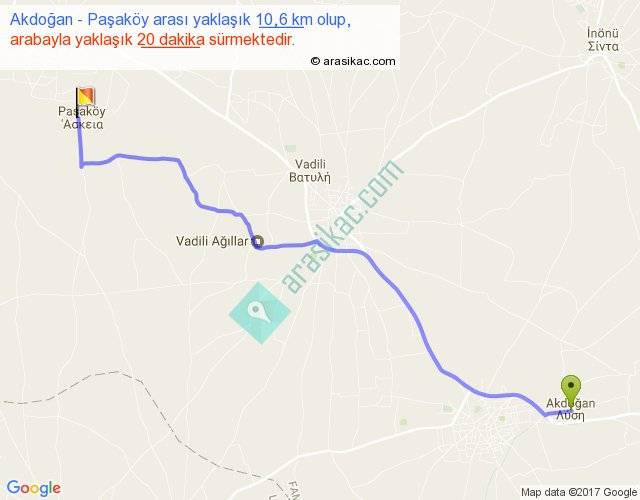Akdoğan - Paşaköy arası yaklaşık olarak 90 km/h ile yukarıda belirtilen sürede olup, iki yerin kuş uçuşu uzaklığı (mesafesi) 9'dir. Yolculuk otobüsle 26 dakika sürmektedir.