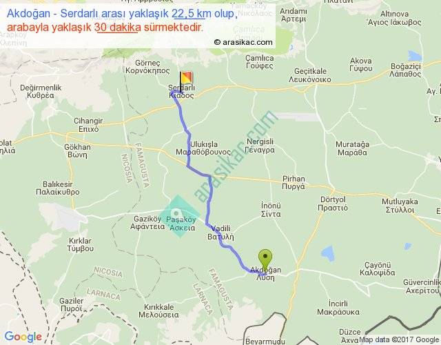 Akdoğan - Serdarlı arası yaklaşık olarak 90 km/h ile yukarıda belirtilen sürede olup, iki yerin kuş uçuşu uzaklığı (mesafesi) 18'dir. Yolculuk otobüsle 39 dakika sürmektedir.