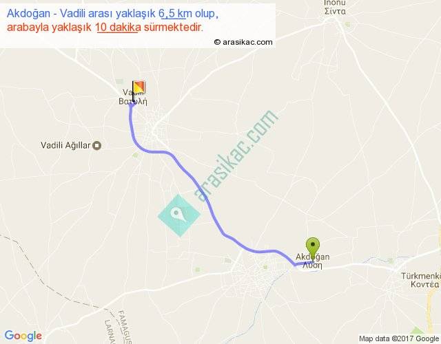 Akdoğan - Vadili arası yaklaşık olarak 90 km/h ile yukarıda belirtilen sürede olup, iki yerin kuş uçuşu uzaklığı (mesafesi) 5'dir. Yolculuk otobüsle 13 dakika sürmektedir.