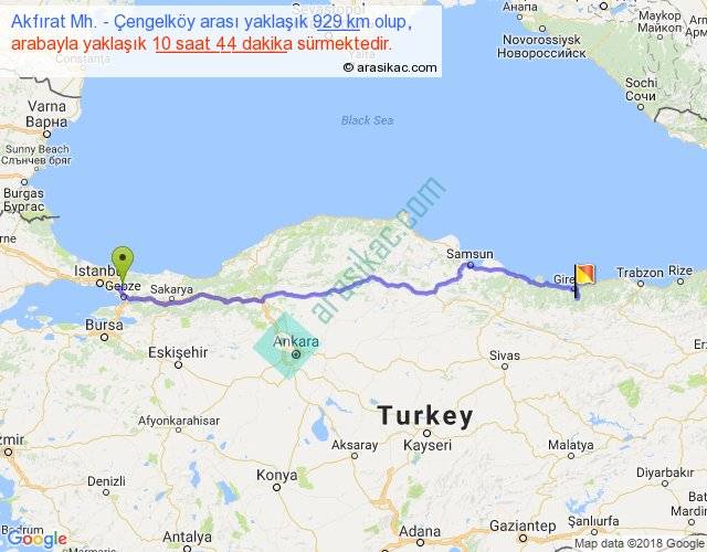 Akfırat Mh. - Çengelköy arası yaklaşık olarak 90 km/h ile yukarıda belirtilen sürede olup, iki yerin kuş uçuşu uzaklığı (mesafesi) 754'dir. Eğer belirtilen yerler arasında uçak seferi var ise bu süre uçakla 1 saat 09 dakika'ya kadar düşebilir. Yolculuk otobüsle 13 saat 57 dakika sürmektedir.