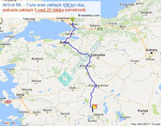 Akfırat Mh. - Tuzla arası yaklaşık olarak 90 km/h ile yukarıda belirtilen sürede olup, iki yerin kuş uçuşu uzaklığı (mesafesi) 339'dir. Eğer belirtilen yerler arasında uçak seferi var ise bu süre uçakla 31 dakika'ya kadar düşebilir. Yolculuk otobüsle 6 saat 56 dakika sürmektedir.