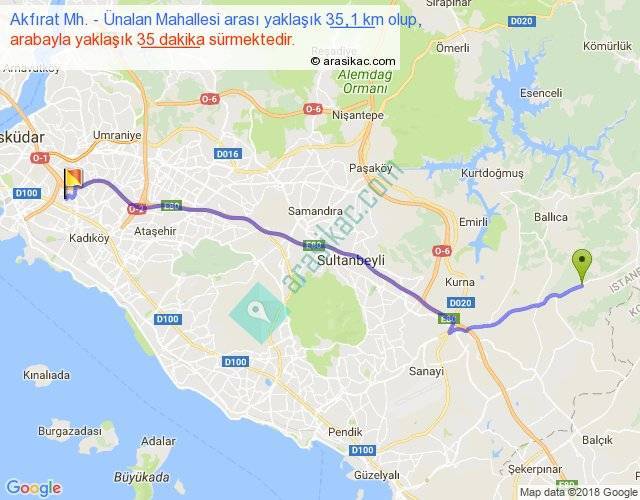 Akfırat Mh. - Ünalan Mahallesi arası yaklaşık olarak 90 km/h ile yukarıda belirtilen sürede olup, iki yerin kuş uçuşu uzaklığı (mesafesi) 30'dir. Yolculuk otobüsle 45 dakika sürmektedir.