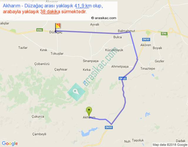 Akharım - Düzağaç arası yaklaşık olarak 90 km/h ile yukarıda belirtilen sürede olup, iki yerin kuş uçuşu uzaklığı (mesafesi) 18'dir. Yolculuk otobüsle 49 dakika sürmektedir.