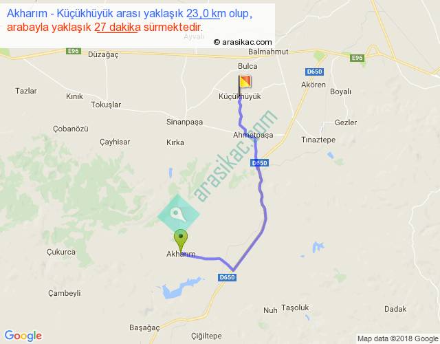 Akharım - Küçükhüyük arası yaklaşık olarak 90 km/h ile yukarıda belirtilen sürede olup, iki yerin kuş uçuşu uzaklığı (mesafesi) 14'dir. Yolculuk otobüsle 35 dakika sürmektedir.