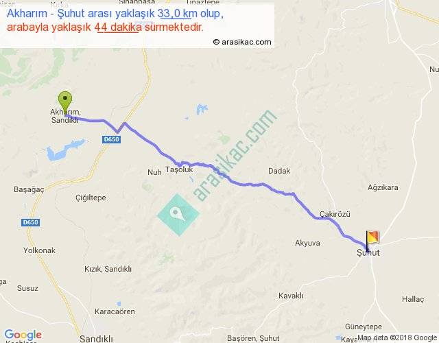 Akharım - Şuhut arası yaklaşık olarak 90 km/h ile yukarıda belirtilen sürede olup, iki yerin kuş uçuşu uzaklığı (mesafesi) 29'dir. Yolculuk otobüsle 57 dakika sürmektedir.