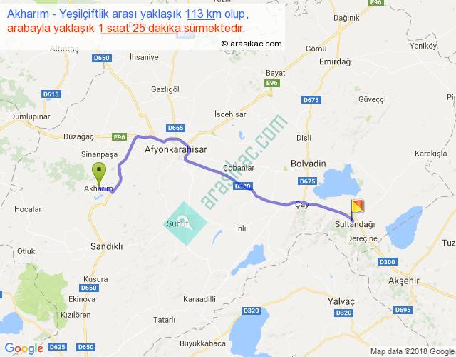Akharım - Yeşilçiftlik arası yaklaşık olarak 90 km/h ile yukarıda belirtilen sürede olup, iki yerin kuş uçuşu uzaklığı (mesafesi) 85'dir. Yolculuk otobüsle 1 saat 50 dakika sürmektedir.