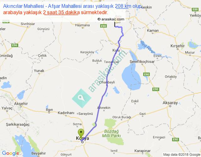 Akıncılar Mahallesi - Afşar Mahallesi arası yaklaşık olarak 90 km/h ile yukarıda belirtilen sürede olup, iki yerin kuş uçuşu uzaklığı (mesafesi) 179'dir. Yolculuk otobüsle 3 saat 21 dakika sürmektedir.