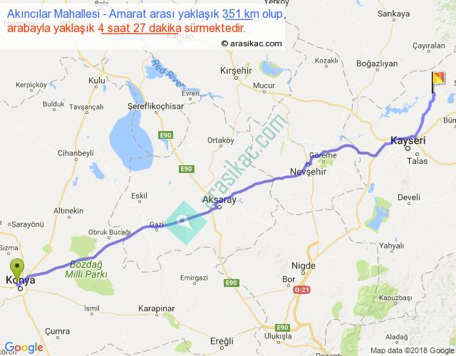 Akıncılar Mahallesi - Amarat arası yaklaşık olarak 90 km/h ile yukarıda belirtilen sürede olup, iki yerin kuş uçuşu uzaklığı (mesafesi) 306'dir. Eğer belirtilen yerler arasında uçak seferi var ise bu süre uçakla 28 dakika'ya kadar düşebilir. Yolculuk otobüsle 5 saat 47 dakika sürmektedir.