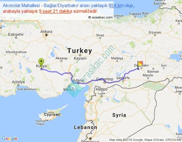Akıncılar Mahallesi - Bağlar Diyarbakır arası yaklaşık olarak 90 km/h ile yukarıda belirtilen sürede olup, iki yerin kuş uçuşu uzaklığı (mesafesi) 655'dir. Eğer belirtilen yerler arasında uçak seferi var ise bu süre uçakla 1 saat 00 dakika'ya kadar düşebilir. Yolculuk otobüsle 12 saat 9 dakika sürmektedir.