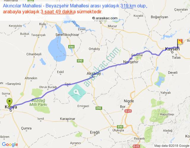 Akıncılar Mahallesi - Beyazşehir Mahallesi arası yaklaşık olarak 90 km/h ile yukarıda belirtilen sürede olup, iki yerin kuş uçuşu uzaklığı (mesafesi) 287'dir. Eğer belirtilen yerler arasında uçak seferi var ise bu süre uçakla 26 dakika'ya kadar düşebilir. Yolculuk otobüsle 4 saat 57 dakika sürmektedir.