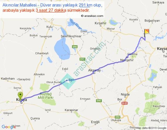 Akıncılar Mahallesi - Düver arası yaklaşık olarak 90 km/h ile yukarıda belirtilen sürede olup, iki yerin kuş uçuşu uzaklığı (mesafesi) 256'dir. Eğer belirtilen yerler arasında uçak seferi var ise bu süre uçakla 23 dakika'ya kadar düşebilir. Yolculuk otobüsle 4 saat 29 dakika sürmektedir.