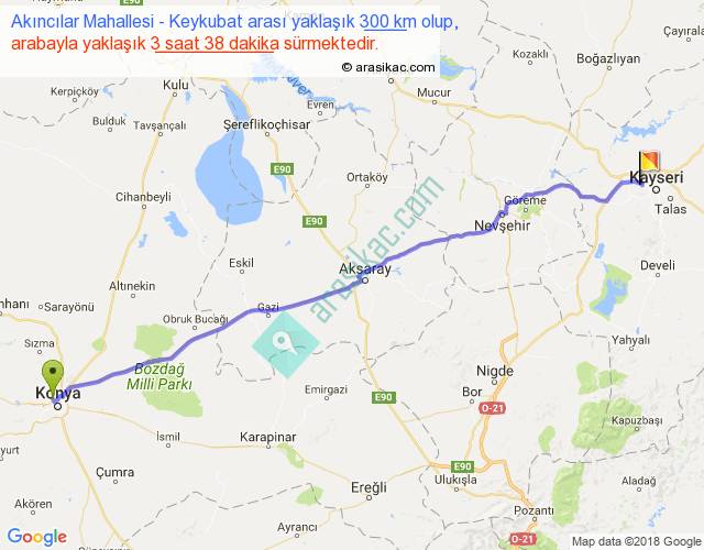 Akıncılar Mahallesi - Keykubat arası yaklaşık olarak 90 km/h ile yukarıda belirtilen sürede olup, iki yerin kuş uçuşu uzaklığı (mesafesi) 272'dir. Eğer belirtilen yerler arasında uçak seferi var ise bu süre uçakla 25 dakika'ya kadar düşebilir. Yolculuk otobüsle 4 saat 43 dakika sürmektedir.