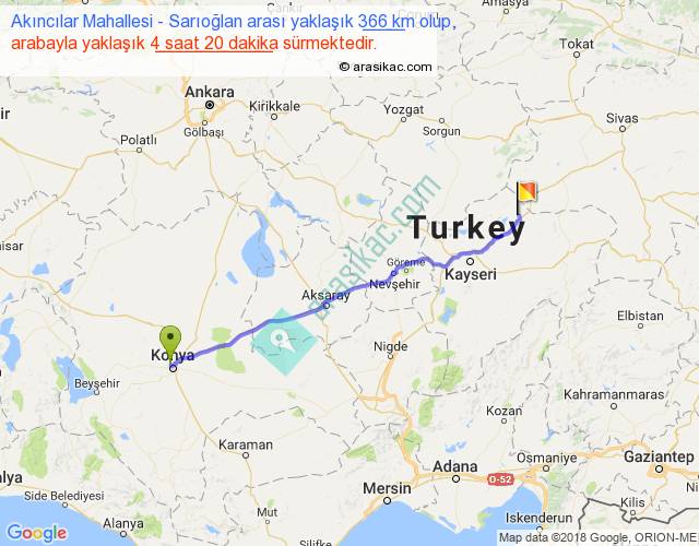 Akıncılar Mahallesi - Sarıoğlan arası yaklaşık olarak 90 km/h ile yukarıda belirtilen sürede olup, iki yerin kuş uçuşu uzaklığı (mesafesi) 329'dir. Eğer belirtilen yerler arasında uçak seferi var ise bu süre uçakla 30 dakika'ya kadar düşebilir. Yolculuk otobüsle 5 saat 38 dakika sürmektedir.
