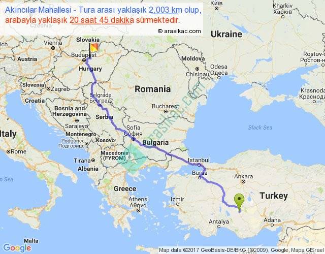 Akıncılar Mahallesi - Tura arası yaklaşık olarak 90 km/h ile yukarıda belirtilen sürede olup, iki yerin kuş uçuşu uzaklığı (mesafesi) 1494'dir. Eğer belirtilen yerler arasında uçak seferi var ise bu süre uçakla 2 saat 17 dakika'ya kadar düşebilir. Yolculuk otobüsle 1 gün 2 saat sürmektedir.