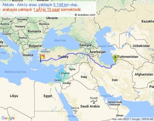 Akkale - Akköy arası yaklaşık olarak 90 km/h ile yukarıda belirtilen sürede olup, iki yerin kuş uçuşu uzaklığı (mesafesi) 2384'dir. Eğer belirtilen yerler arasında uçak seferi var ise bu süre uçakla 3 saat 40 dakika'ya kadar düşebilir. Yolculuk otobüsle 2 gün 0 saat sürmektedir.