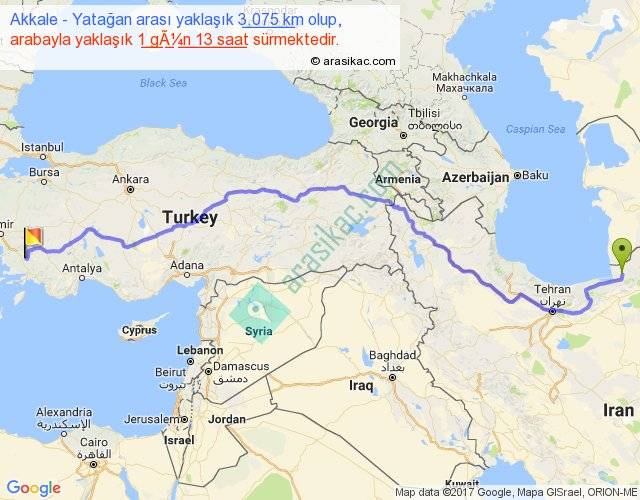 Akkale - Yatağan arası yaklaşık olarak 90 km/h ile yukarıda belirtilen sürede olup, iki yerin kuş uçuşu uzaklığı (mesafesi) 2298'dir. Eğer belirtilen yerler arasında uçak seferi var ise bu süre uçakla 3 saat 32 dakika'ya kadar düşebilir. Yolculuk otobüsle 2 gün 0 saat sürmektedir.