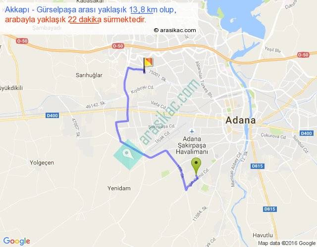 Akkapı - Gürselpaşa arası yaklaşık olarak 90 km/h ile yukarıda belirtilen sürede olup, iki yerin kuş uçuşu uzaklığı (mesafesi) 7'dir. Yolculuk otobüsle 28 dakika sürmektedir.