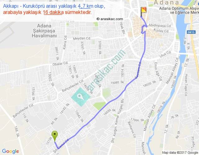 Akkapı - Kuruköprü arası yaklaşık olarak 90 km/h ile yukarıda belirtilen sürede olup, iki yerin kuş uçuşu uzaklığı (mesafesi) 4'dir. Yolculuk otobüsle 20 dakika sürmektedir.