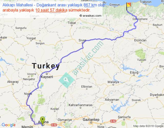 Akkapı Mahallesi - Doğankent arası yaklaşık olarak 90 km/h ile yukarıda belirtilen sürede olup, iki yerin kuş uçuşu uzaklığı (mesafesi) 527'dir. Eğer belirtilen yerler arasında uçak seferi var ise bu süre uçakla 48 dakika'ya kadar düşebilir. Yolculuk otobüsle 14 saat 14 dakika sürmektedir.