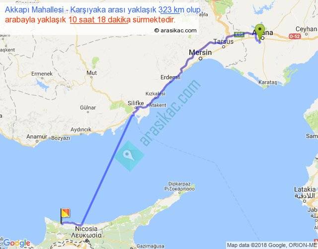 Akkapı Mahallesi - Karşıyaka arası yaklaşık olarak 90 km/h ile yukarıda belirtilen sürede olup, iki yerin kuş uçuşu uzaklığı (mesafesi) 265'dir. Eğer belirtilen yerler arasında uçak seferi var ise bu süre uçakla 24 dakika'ya kadar düşebilir. Yolculuk otobüsle 13 saat 23 dakika sürmektedir.